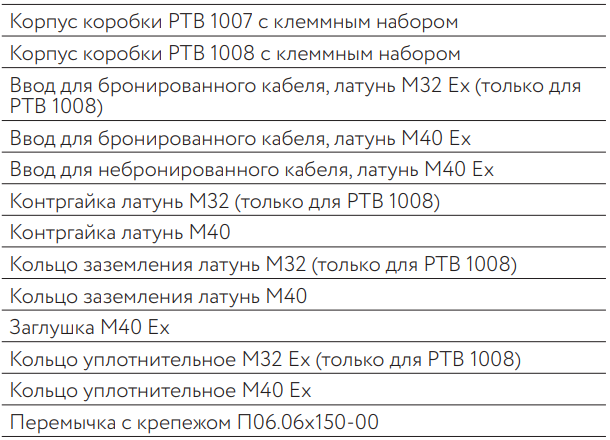 Комплект поставки соединительных коробок РТВ 1007 и 1008: