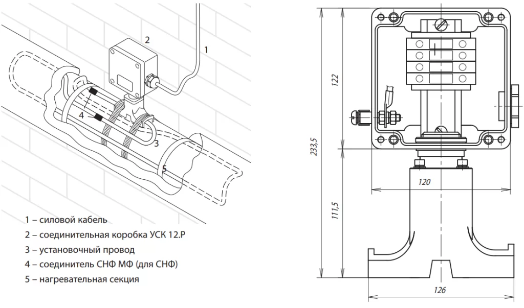Коробка УСК 12.Р предназначена для подключения к силовой сети электрических нагревательных кабелей постоянной мощности типа СНФ и ТМФ. Коробка крепится непосредственно на трубопроводе. Коробка позволяет выполнить подключение одного или двух ниток нагревательных секций «петлей», либо 3 секций по схеме «звезда». Конструкция корпуса обеспечивает защи ту от проникновения влаги и пыли IP66 и высокую коррозионную стойкость. Применяемые клеммные наборы позволяют обеспечить подключение многожильных или одножильных проводов сечением от 1,5 до 10 мм².