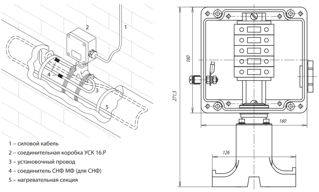 Коробка УСК 16.Р предназначена для подключения к силовой сети электрических нагревательных кабелей постоянной мощности типа СНФ и ТМФ. Коробка крепится непосредственно на трубопроводе. Коробка позволяет выполнить подключение одного или двух ниток нагревательных секций «петлей», либо 3 секций по схеме «звезда». Конструкция корпуса обеспечивает защиту от проникновения влаги и пыли IP66 и высокую коррозионную стойкость. Применяемые клеммные наборы позволяют обеспечить подключение многожильных или одножильных проводов сечением от 1,5 до 16 мм².