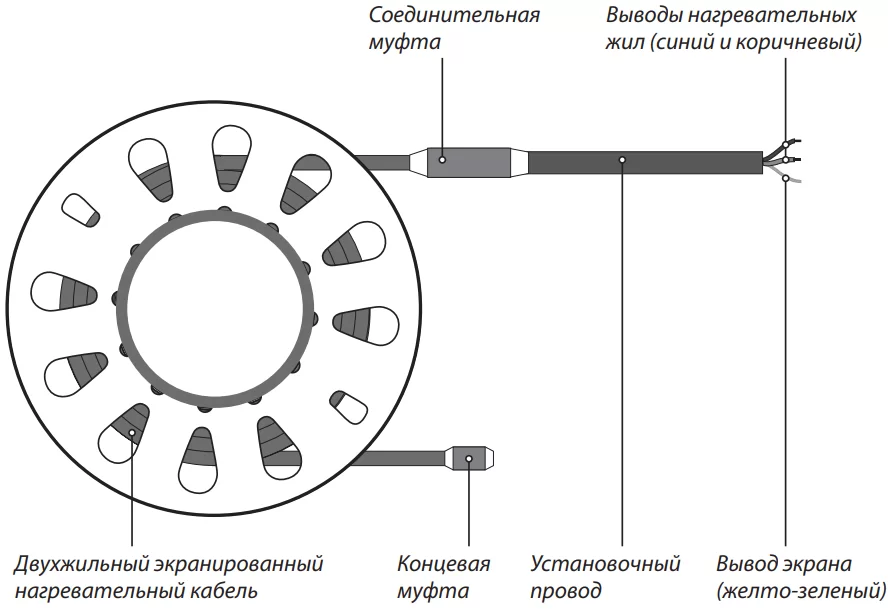 Кабель нагревательный состоит из двухжильного экранированного нагревательного кабеля. Кабель нагревательный оснащен с одной стороны соединительной муфтой и установочным проводом, с другой стороны концевой муфтой.