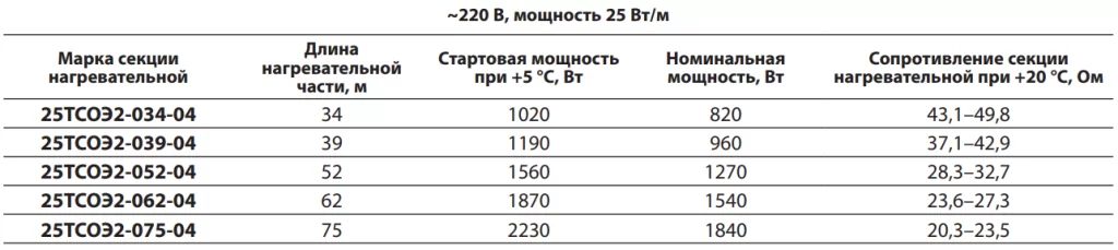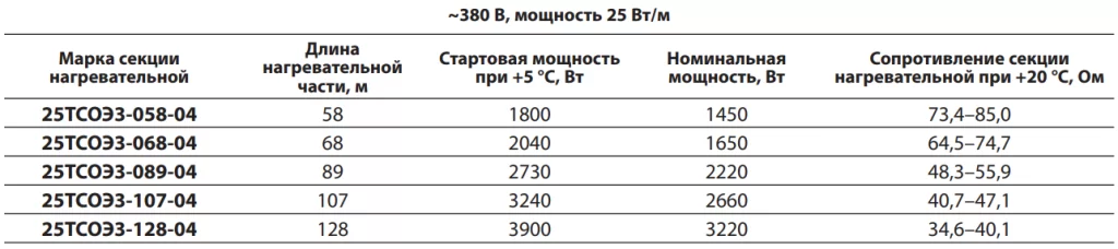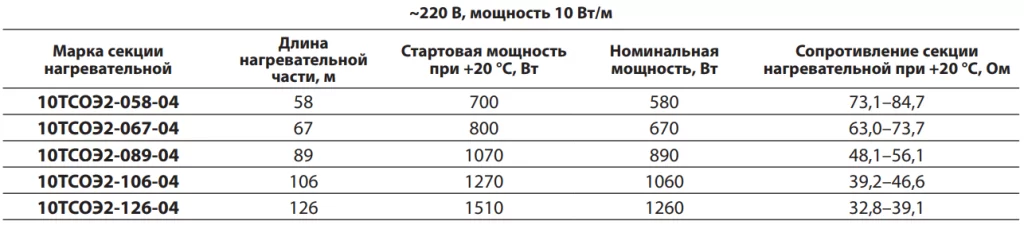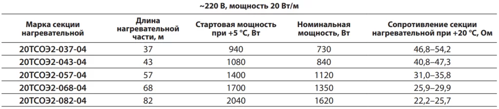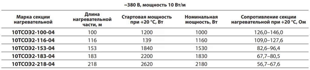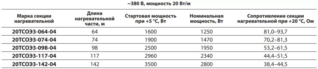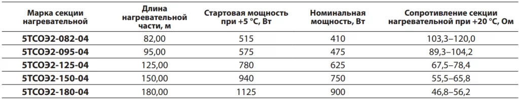 Параметры стандартных секций нагревательных ТСОЭ для систем обогрева кровли: