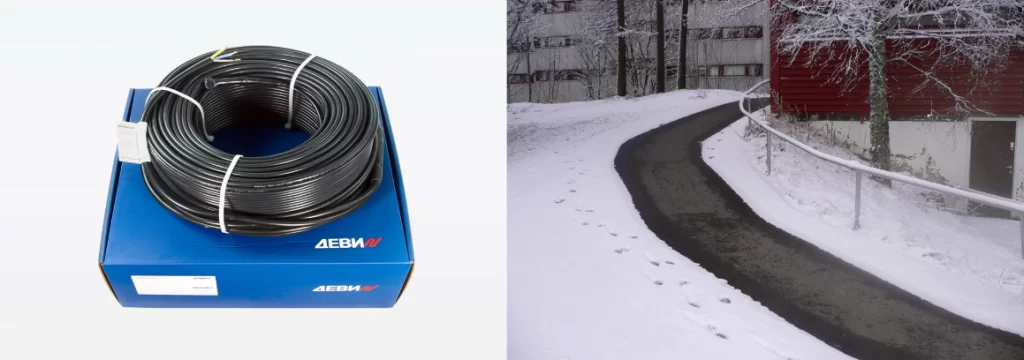 Кабель DEVIsnow 30T применяется для обогрева открытых уличных площадок - стаивание снега, предотвращение образования наледи (не имеет ограничений в системах снеготаяния на грунте). Второе специализированное применение — это предотвращения образования сосулек на кровле, желобах и водостоков. Кабель DTCE-30 изготовлен в виде готовых секций двухжильного нагревательного кабеля, мощностью 30 Вт на 1м.п., со сплошным экраном и жесткой оболочкой из ПВХ черного цвета (защищена от ультрафиолета), укомплектован токоподводящим холодным концом и герметичными переходной и концевой муфтами. Поставляется в виде готовых нагревательных секций на катушках.