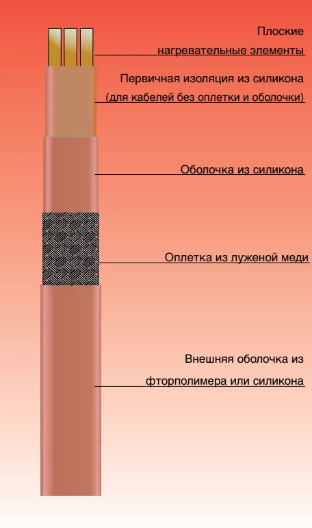 Проводники, покрытые силиконовой резиной для придания гибкости. Возможно исполнение с оплеткой из луженой меди и внешней оболочкой из силикона для придания дополнительной механической прочности или для заземления нагревательного кабеля. Оплетка обязательна при применении кабеля во взрывоопасных зонах.