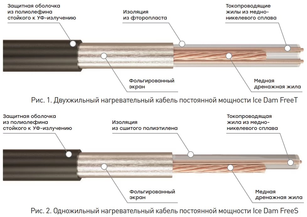 Секции состоят из нагревательного кабеля, холодного конца, соединительных и концевых муфт. В качестве нагревательного элемента используется проводник, который обладает высоким сопротивлением. В основу его конструкции входят медные жилы: одна или две. В зависимости от этого резистивный нагревательный кабель разделяется на два вида: одножильный кабель и двухжильный кабель. Одножильный резистивный нагревательный кабель Ice Dam Free S имеет одну нагревательную токопроводящую жилу, которая занимает всю длину конструкции. Электропитание подводится с двух сторон изделия. Конструкция с двумя жилами Ice Dam Free T включает два провода: нагревательный и токопроводящий. Электрический ток подается на один конец провода, а на другой конец устанавливается муфта.