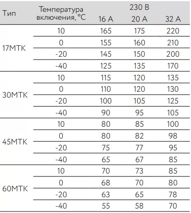 (или суммарная длина секций одной марки, подключаемых параллельно) в зависимости от типа автоматического выключателя питания: