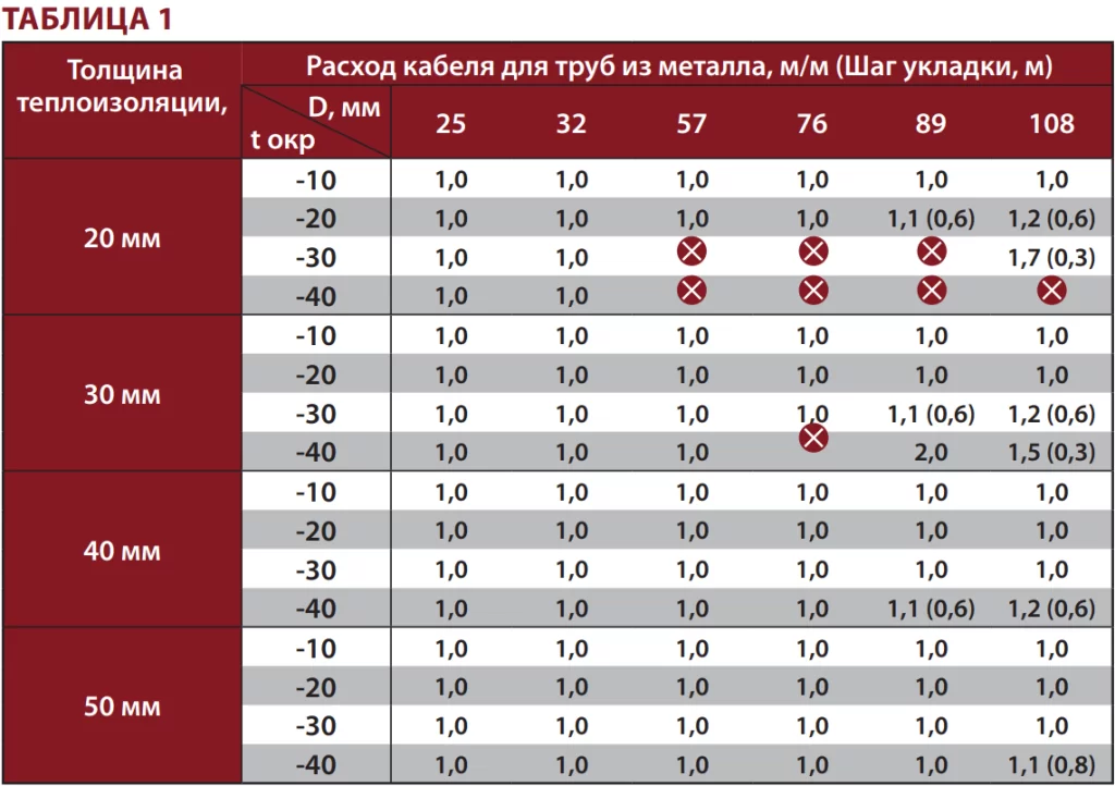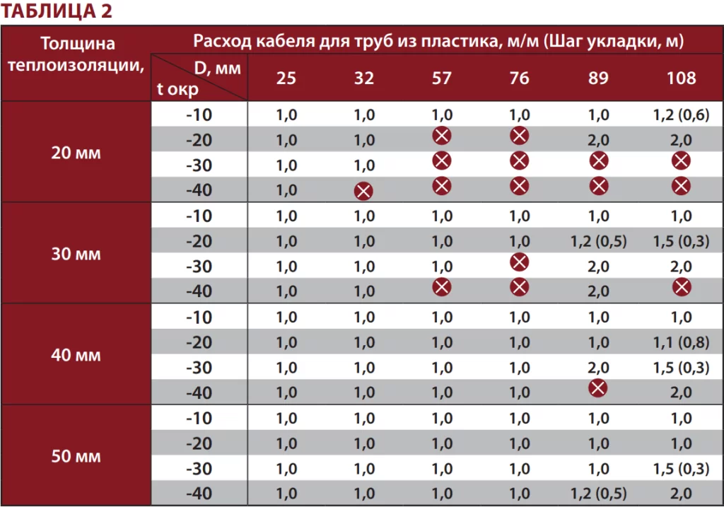 * Для тех диаметров труб, где значения расхода кабеля не указаны, необходимо использовать теплоизоляцию большей толщины.