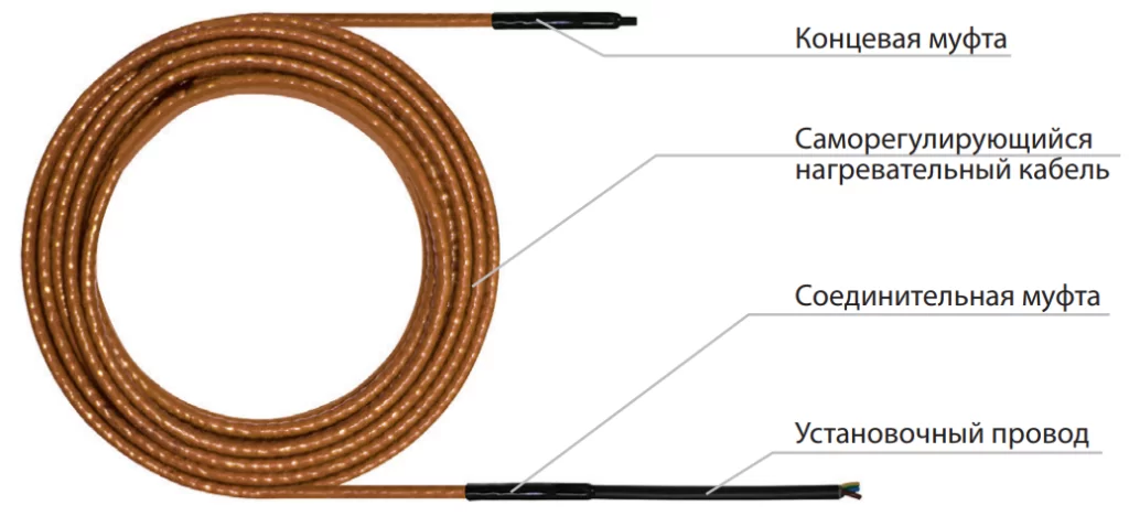 Конструкция нагревательной секции* представляет собой отрезок саморегулирующегося нагревательного кабеля, оснащенный трехметровым установочным проводом с одной стороны и концевой муфтой с другой. Саморегулирующийся кабель состоит из двух параллельных медных проводников, промежуток между которыми заполнен специальным полупроводящим составом (полупроводящая матрица), изменяющим свое сопротивление в зависимости от температуры обогреваемого объекта.