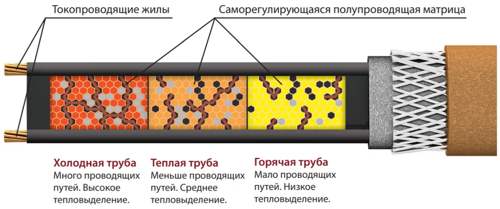 Выделение тепла происходит в полупроводящей матрице, сопротивление которой зависит от температуры поверхности, что обеспечивает эффект саморегулирования, при повышении температуры сопротивление матрицы возрастает, тепловыделение падает и наоборот. Электропитание осуществляется от сети напряжением 220–240 В и подводится с одного конца. В конце участка обогрева установлена концевая муфта.