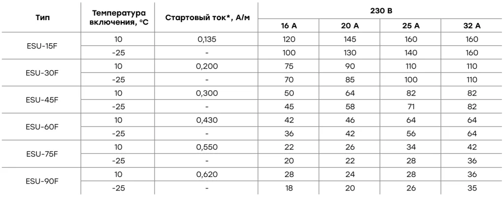 Максимальная длина кабеля ESU при использовании автоматического выключателя типа С: