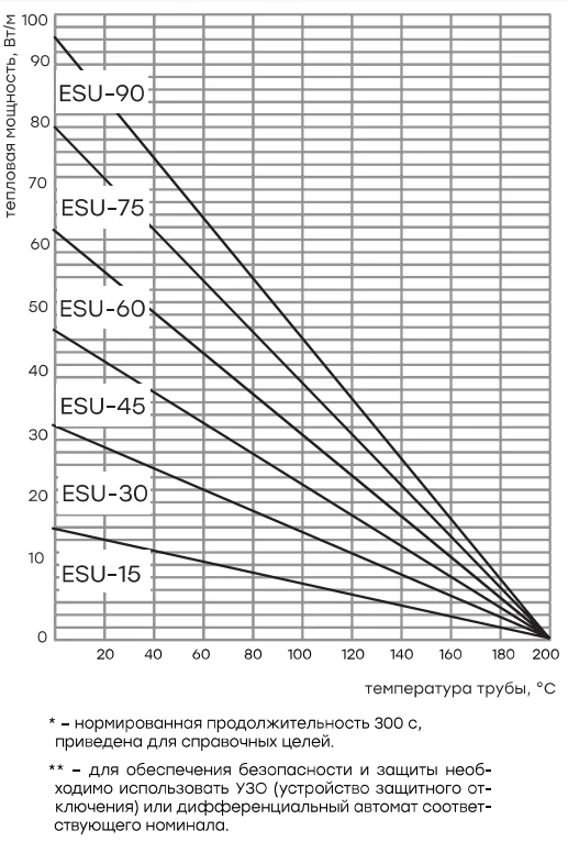 Характеристики мощности кабеля ESU в зависимости от температуры: