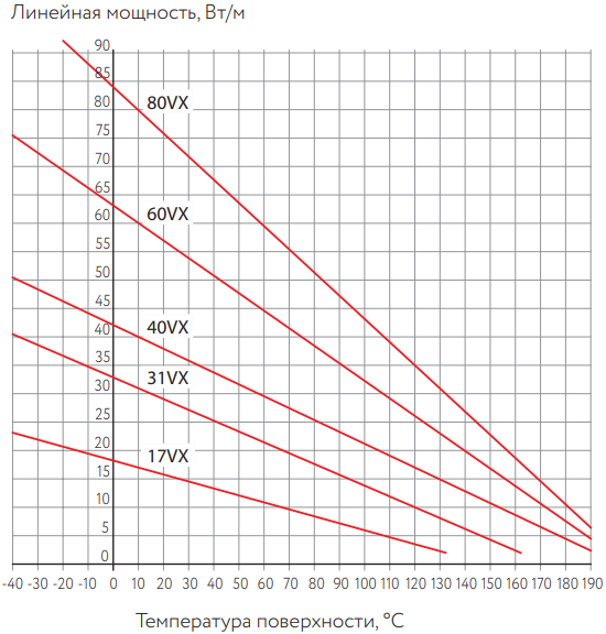 Номинальная мощность для саморегулирующихся нагревательных кабелей при рабочем напряжении 230 В: