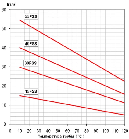 Номинальная выходная мощность кабеля FREEZSTOP Super при питании 230В, когда он установлен на теплоизолированных металлических трубах.