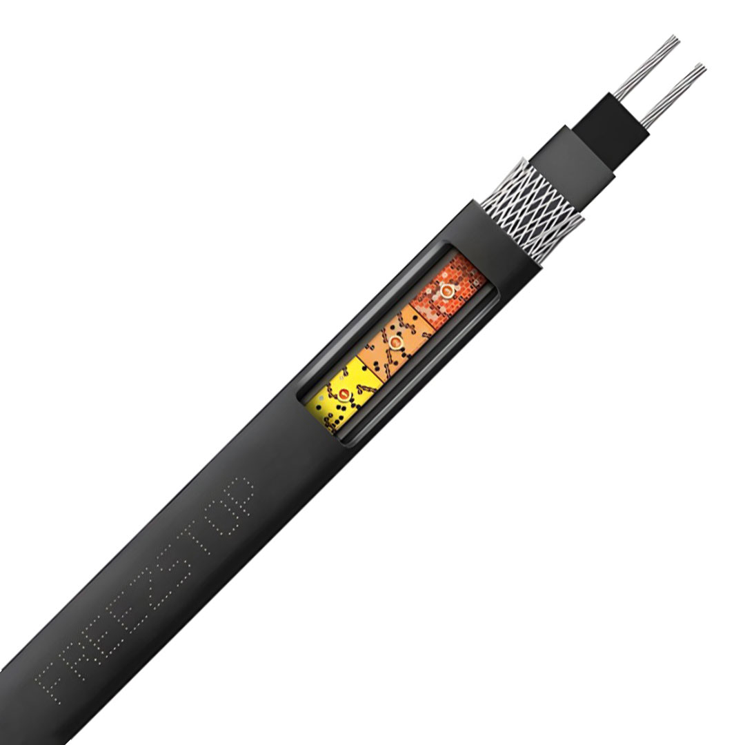 Основой саморегулирующегося греющего кабеля Freezstop служит полупроводящая матрица с частицами графита, внутри которой расположены две токопроводящие медные жилы. Выделение тепла происходит в полупроводящей матрице, сопротивление которой зависит от температуры поверхности, что обеспечивает эффект саморегулирования (при повышении температуры сопротивление матрицы возрастает, тепловыделение падает и наоборот). Благодаря этому свойству, саморегулирующийся греющий кабель Freezstop не будет перегреваться и перегорать даже когда его отдельные участки накладываются друг на друга.