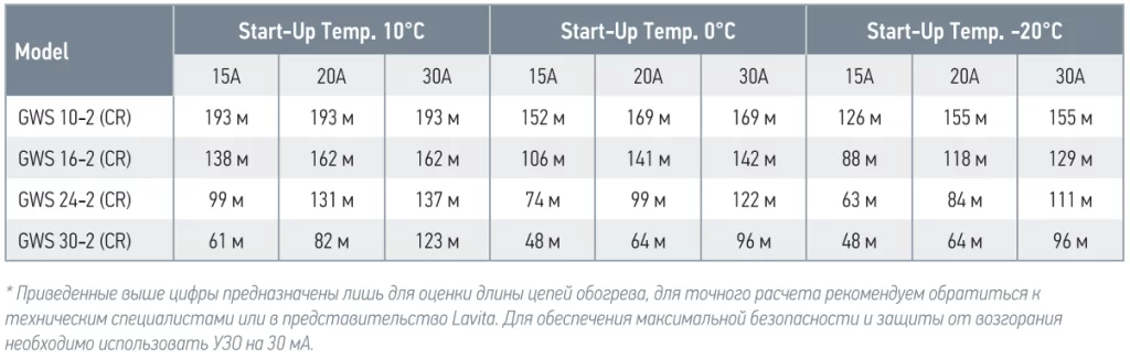 Максимальная длина нагревательной секции нагревательного кабеля LAVITA GWS рассчитывается, исходя из температуры включения и типа автоматического выключателя питания.