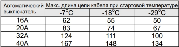 Максимальная длина нагревательной секции нагревательного кабеля SLT рассчитывается, исходя из температуры включения и типа автоматического выключателя питания: