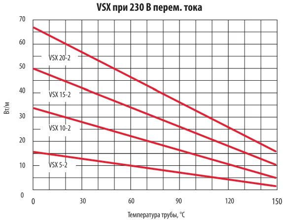 Выходная мощность кабеля VSX может иметь разные показатели в зависимости от температуры окружающей среды: при повышении температуры окружающей среды выходная мощность понижается. Эта особенность позволяет осуществлять монтаж кабеля внахлест, не подвергая его риску повреждения при нарушении температурного режима. Кабели VSX-HT сертифицированы для применения в обычных (не отнесенных к какой-либо категории) зонах и в потенциально взрывоопасных средах в соответствии с директивой ATEX и системой сертификации IEC Ex.