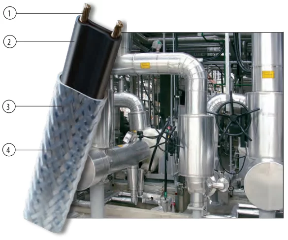 - Полупроводящая нагревательная матрица и фторполимерная диэлектрическая изоляция.