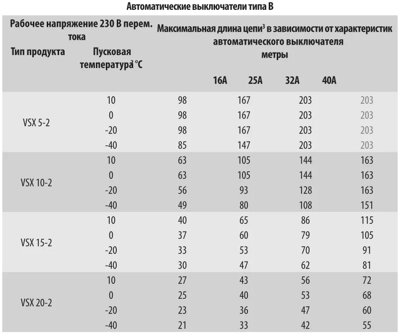 Ниже приведены максимальные значения длины цепи для автоматических выключателей, рассчитанных на определенную силу тока. Номинальные характеристики автоматического выключателя и его защита от замыкания на землю должны соответствовать применимым местным требованиям. За информацией касательно проектирования автоматических выключателей и их производительности при других показателях рабочего напряжения обращайтесь в компанию Термон. Оборудование должно быть оснащено защитой от замыкания на землю для каждой распределительной цепи, обеспечивающей питание электронагревательного оборудования.