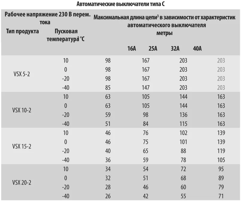 Ниже приведены максимальные значения длины цепи для автоматических выключателей, рассчитанных на определенную силу тока. Номинальные характеристики автоматического выключателя и его защита от замыкания на землю должны соответствовать применимым местным требованиям. За информацией касательно проектирования автоматических выключателей и их производительности при других показателях рабочего напряжения обращайтесь в компанию Термон. Оборудование должно быть оснащено защитой от замыкания на землю для каждой распределительной цепи, обеспечивающей питание электронагревательного оборудования.
