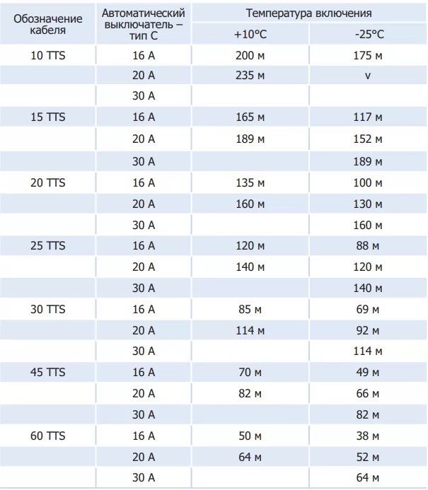 Максимальная рекомендуемая длина нагревательного кабеля при напряжении сети 230 В