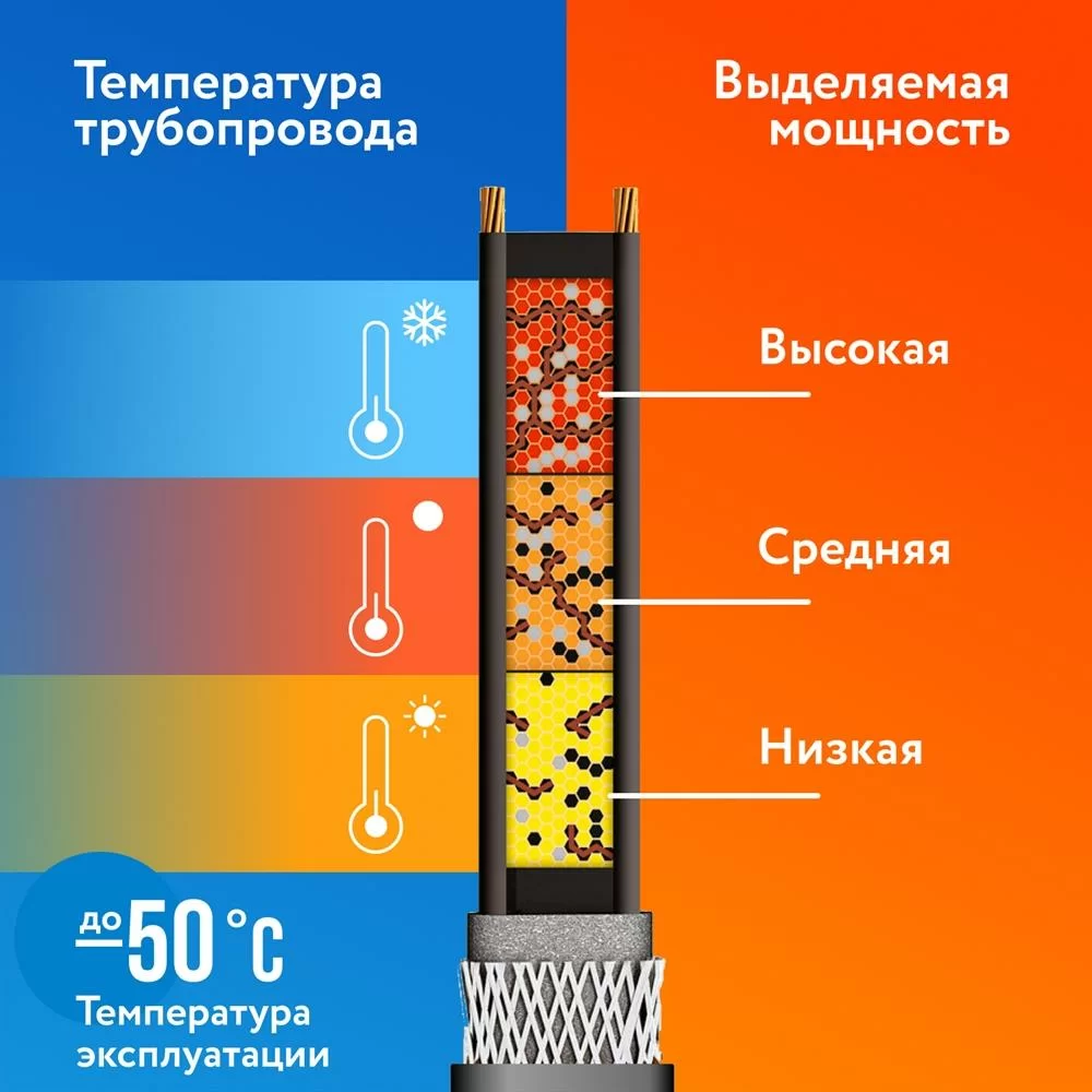 В основу конструкции нагревательного саморегулирующего кабеля положена инновационная запатентованная разработка российских ученых (ГК «ССТ»), которая представляет собой специальную токопроводящую матрицу. Уникальная способность данной матрицы состоит в автоматическом регулировании количества проводимого тока в зависимости от температуры окружающей среды. Этот тип кабеля обеспечивает нагрев поверхности исключительно по потребности. Если на протяжении какого-то участка кабеля температура окружающей среды стала снижаться, то нагревательный саморегулирующийся кабель PipeMate будет автоматически увеличивать количество выделяемого тепла на этом участке, тем самым обеспечивая бОльший нагрев.
