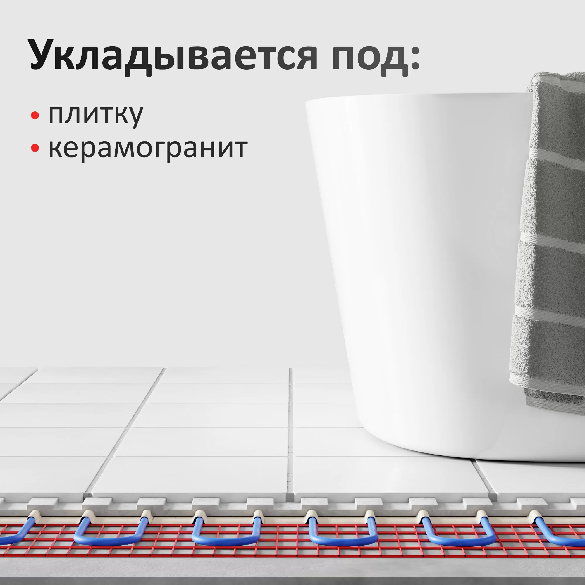 Тёплый пол AlfaMat-150 (9,0 м²) устанавливается под плитку, керамогранит в плиточный клей и максимально прост в монтаже. Просто подготовьте поверхность, расстелите маты и залейте раствором для крепления плитки.*