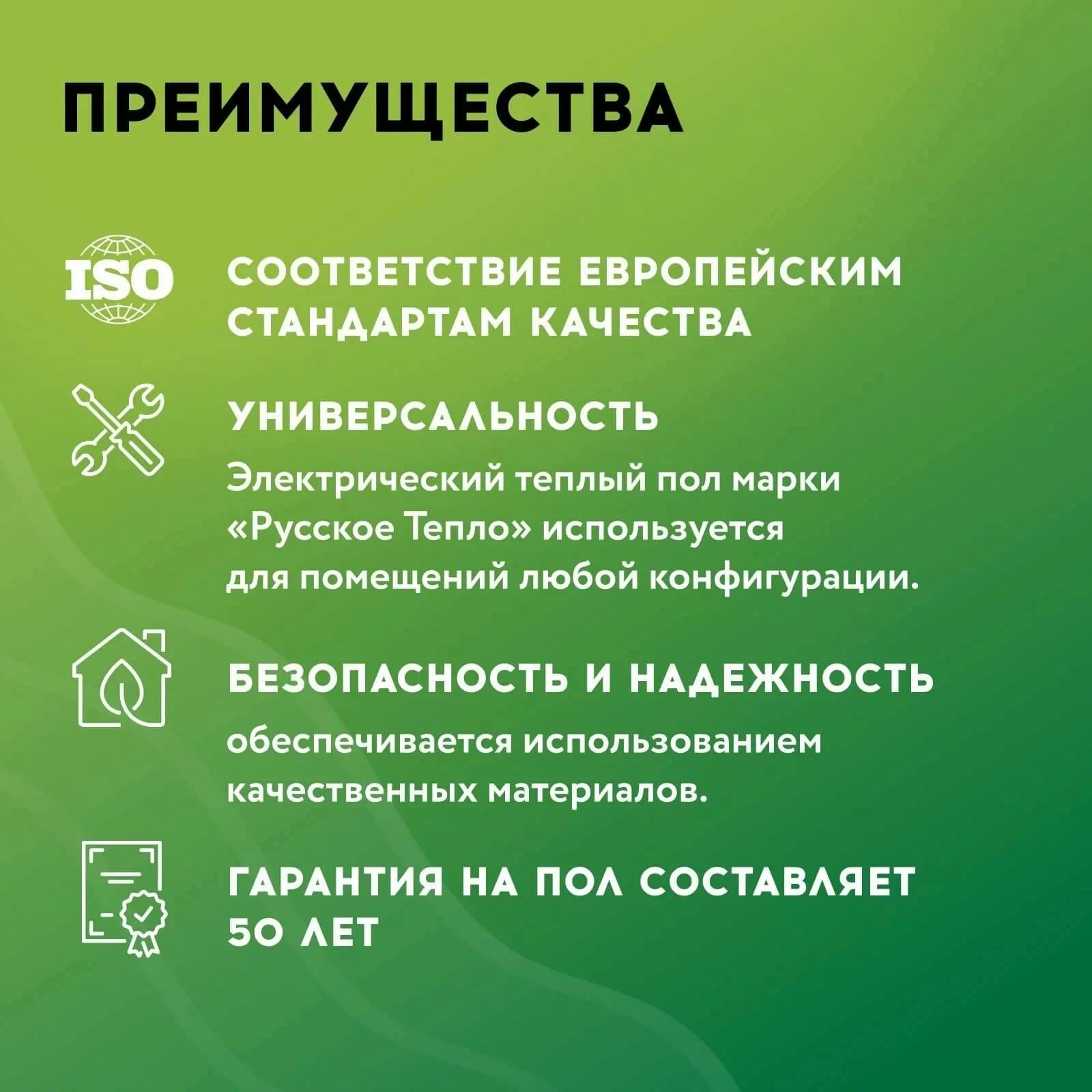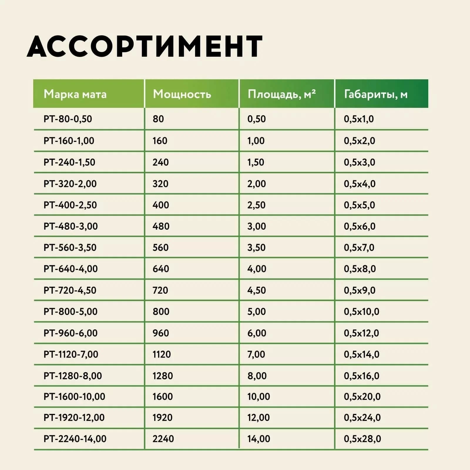 Двухжильный нагревательный мат «Русское тепло» РТ-1120-7,00 предназначен для комфортного обогрева пола в помещениях любого типа. Маты «Русское тепло» могут устанавливаться под любое напольное покрытие: ламинат, линолеум, керамическая плитка, керамогранита , а также их можно монтировать в стены под плитку для того, чтобы избежать промерзания стен, образования конденсата, сырости, плесени и грибка. Обогреваемую зону стены можно использовать в качестве скрытого полотенцесушителя. Мат нагревательный устанавливается в слой плиточного клея 5-8 мм. Нагревательный кабель надежно зафиксирован на сетке, которая позволяет быстро разложить мат. Гарантия на теплый пол «Русское тепло» РТ составляет 50 лет.