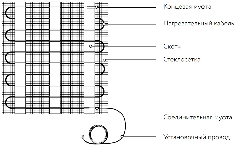 Мат нагревательный представляет собой двужильный нагревательный кабель, разложенный на стеклосетке и оснащенный соединительной, концевой муфтами и установочным проводом.Перед установкой убедитесь в соответствии площади нагревательного мата и площади обогреваемой поверхности. Удельная мощность мата составляет 160 Вт/м2